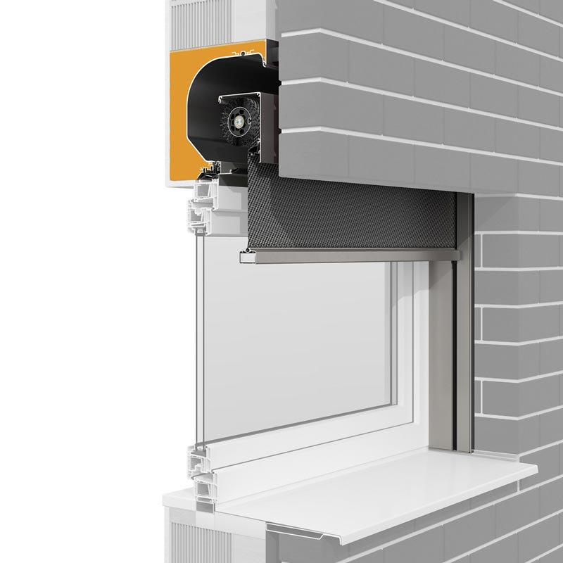 Das Textilscreens-Aufsatzsystem aus Kunststoff. Optional mit außenliegenden Putzträgern oder Aluminiumaußenblende. Die Kastenteile zum Rauminneren bestehen aus einer doppelten Hohlkammer und sorgen somit für Stabilität, Isolierfähigkeit und hohe Schallschutzwerte.